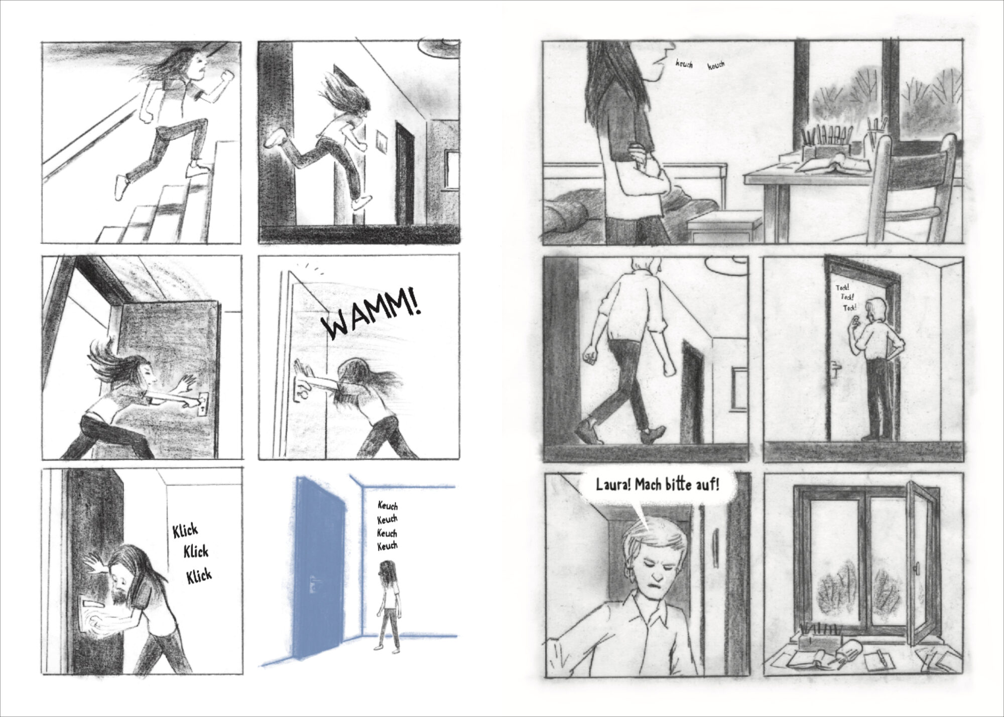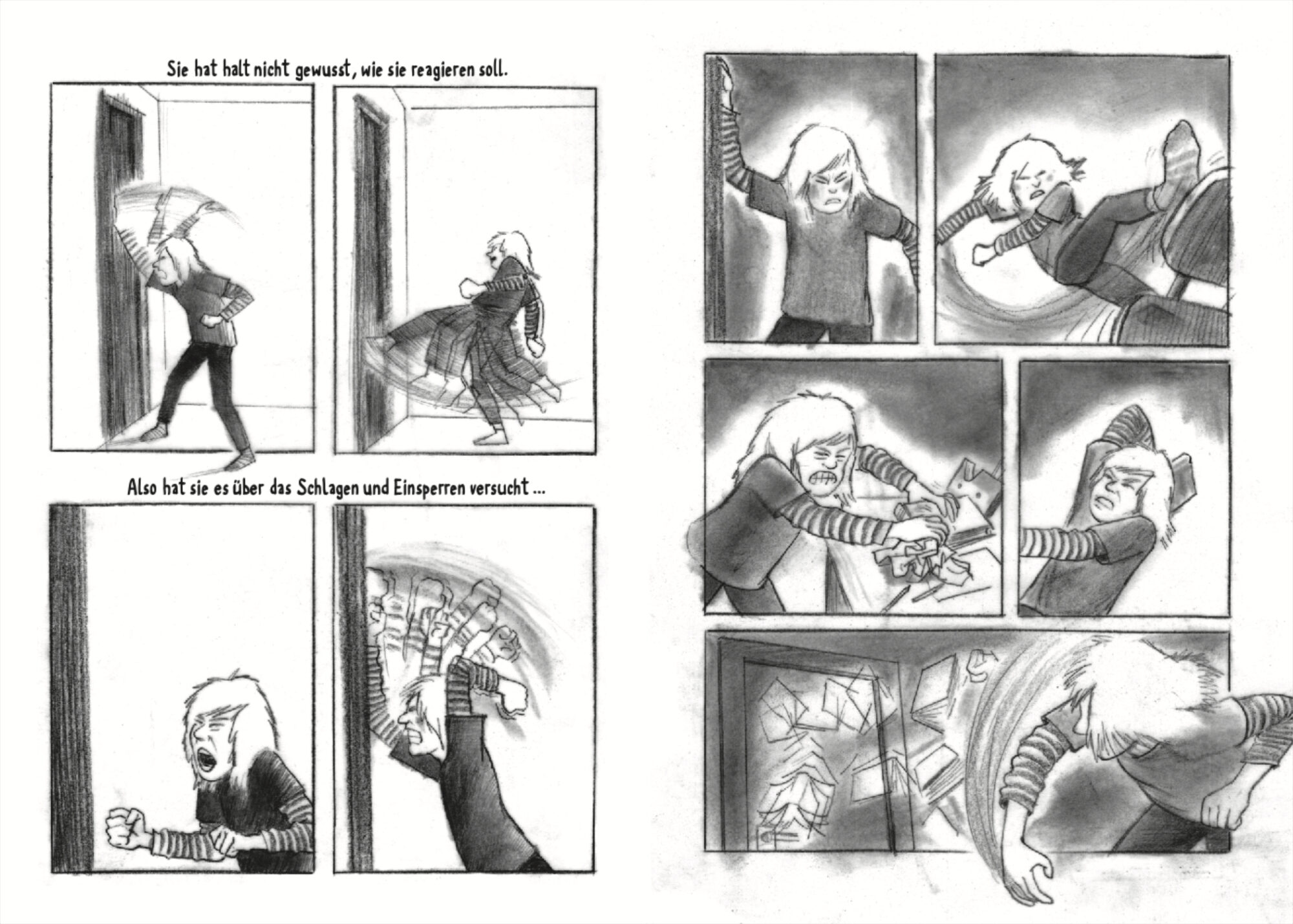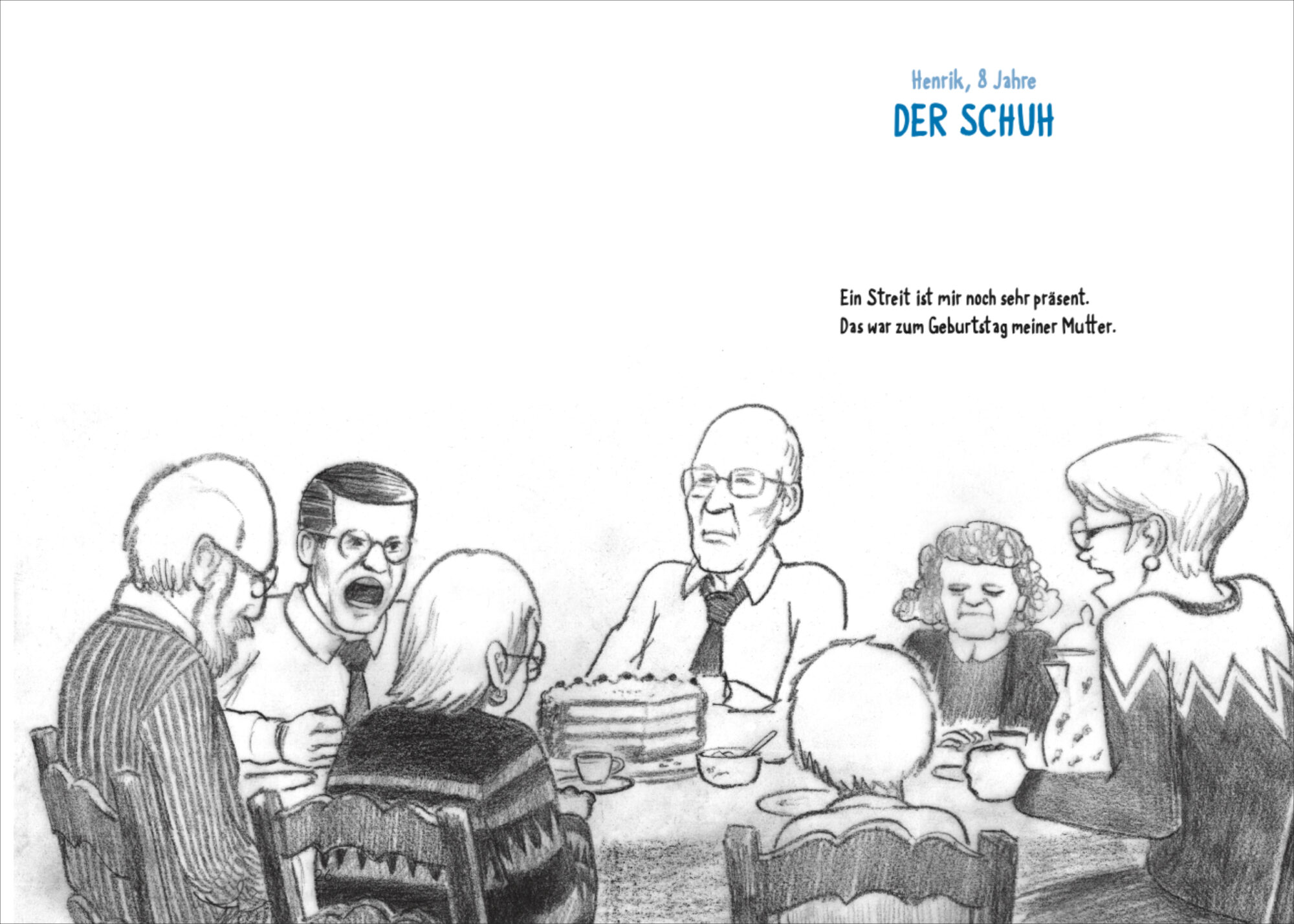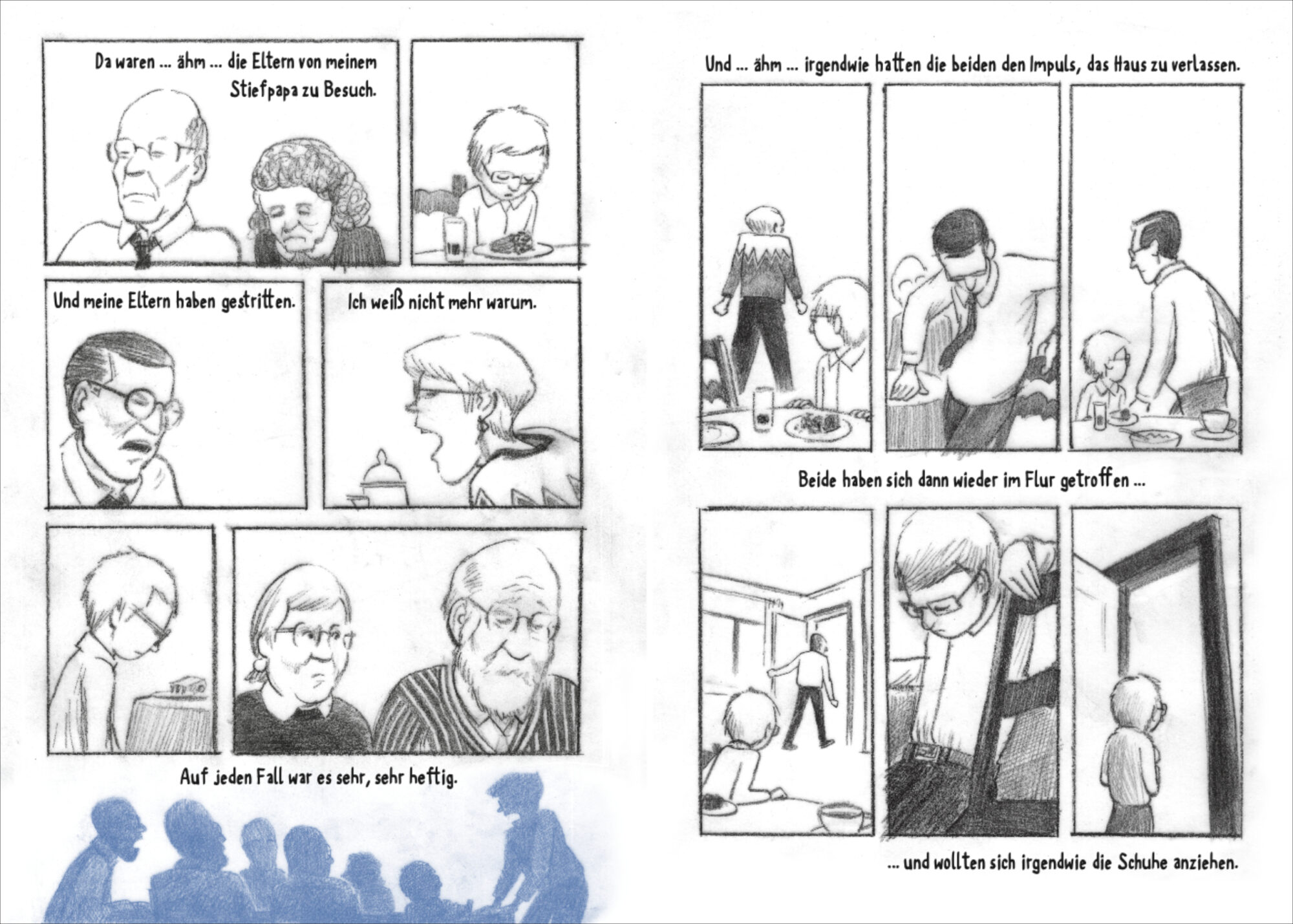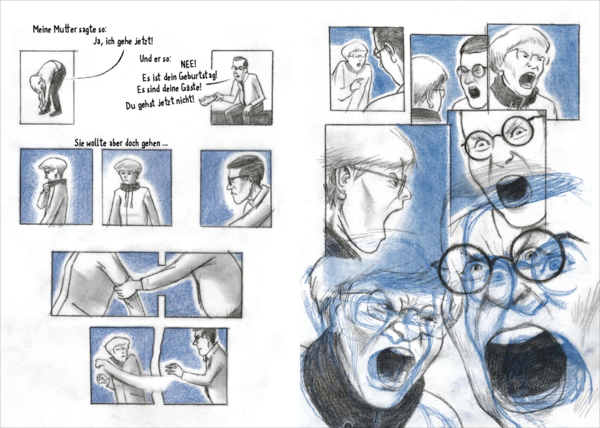 Von Kindern, Eltern und Gewalt ist ein Sachcomic für Erwachsene. Im Buch wird häusliche Gewalt, welche Kinder durch einen Elternteil gegen den anderen bzw. gegen sich selbst erleben, in den Blick genommen. Der Sachtext von Anja Pannewitz wird von kurzen Comicepisoden begleitet, die ich gezeichnet habe. Sie entspringen überwiegend wissenschaftlichen biografischen Interviews mit in ihrer Kindheit betroffenen Erwachsenen.